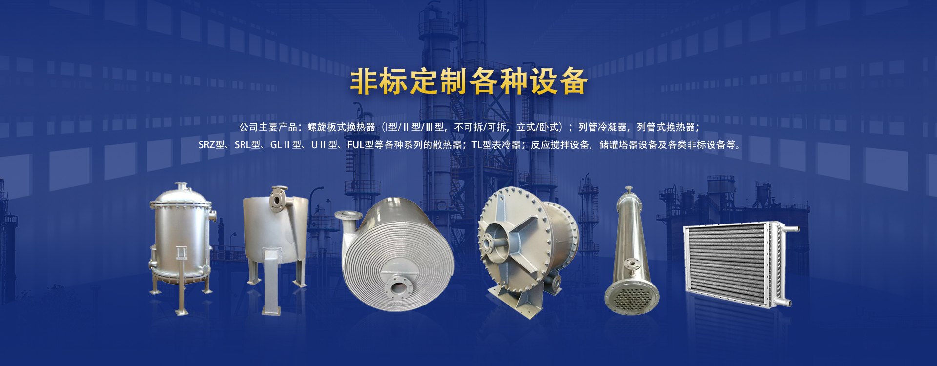 公司主要產品:螺旋板式換熱器(I型/Ⅱ型/Ⅲ型,不可拆/可拆,立式/臥式);列管冷凝器,列管式換熱器;SRZ型、SRL型、GLⅡ型、UⅡ型、FUL型等各種系列的散熱器;TL型表冷器;反應攪拌設備,儲罐塔器設備及各類非標設備等。